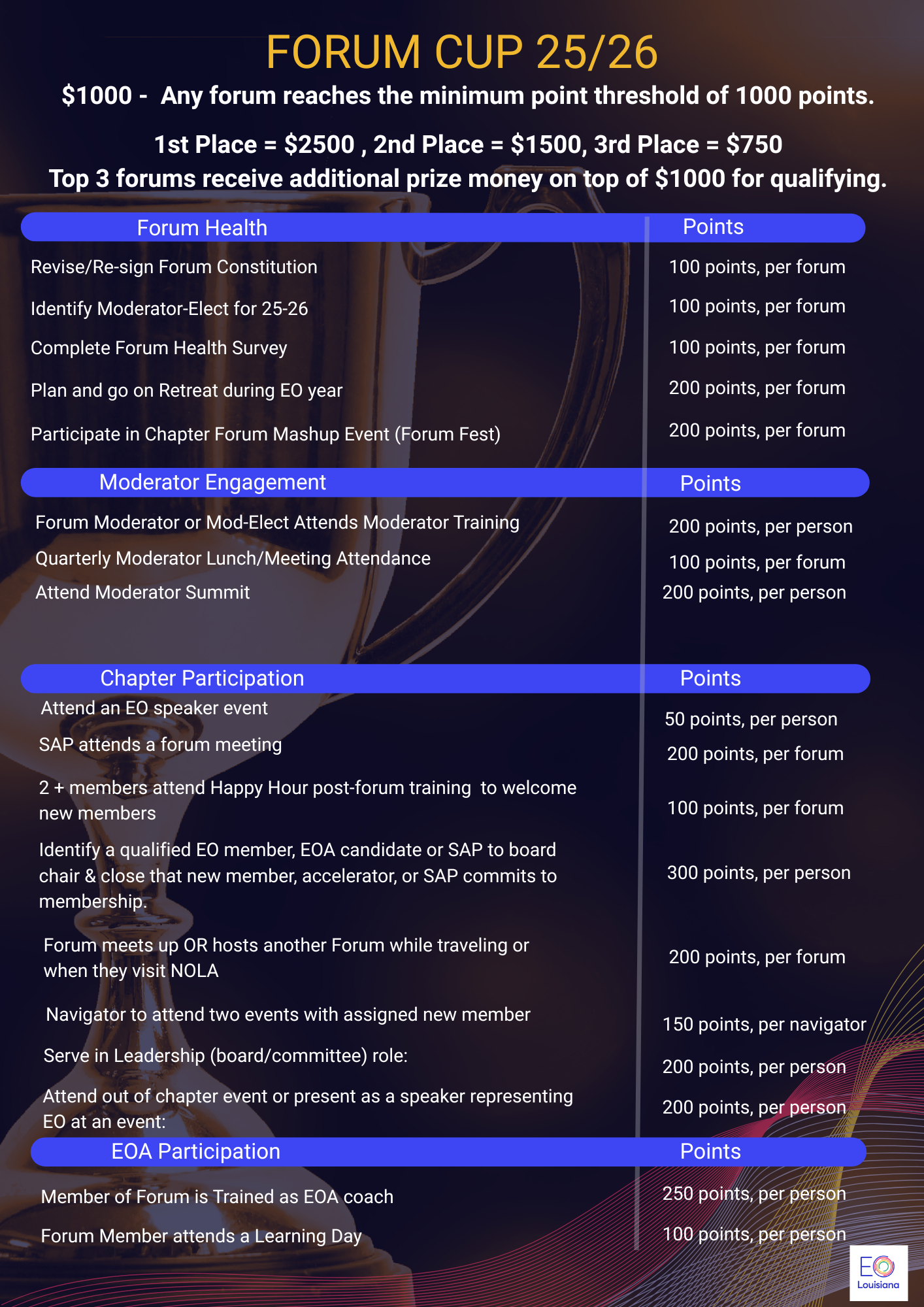 The Forum Cup is our annual, chapter-wide competition designed to spark engagement, strengthen connections, and help every Forum fully experience all that Entrepreneurs’ Organization (EO) has to offer.